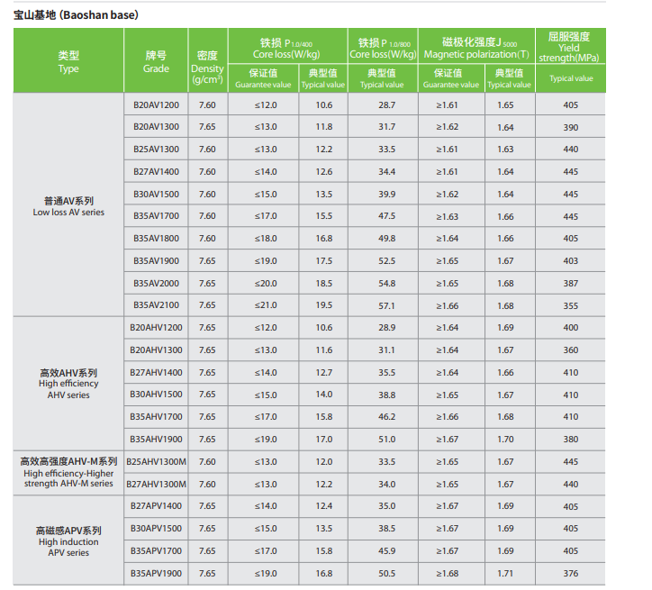 ● 高效高强度系列:磁感、铁损、强度三者综合性能优异;