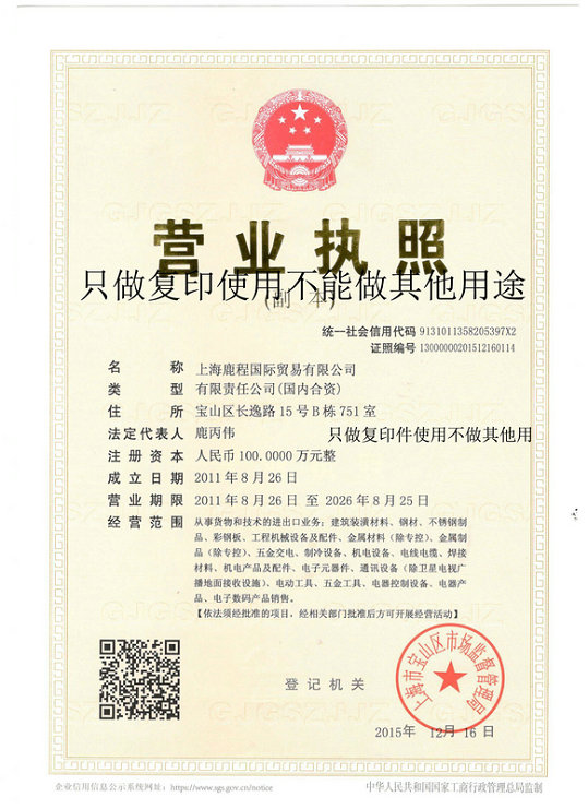 上海鹿程国际贸易有限公司(上海昌润和供应链有限公司)是一家专业销售宝钢,武钢及国内外各大钢厂钢材产品的贸易公司。公司位于上海市宝山区蕰川公路777号宝钢浦钢厂区612室,公司自成立以来,本着诚信经营,品质第一,互利双赢,长远发展的的经营理念。客户遍及全国各个行业。公司拥有完善的销售网络,并可为客户代运输与加工等一条龙服务。公司主营宝钢武钢及进口冷轧有取向及无取向电工钢(硅钢)卷,热轧高强钢板耐磨钢板防弹钢板,冷轧卷(板)、热轧卷(板)、热镀锌卷(板)、酸洗卷板、汽车结构钢卷(板)(汽车大梁钢......